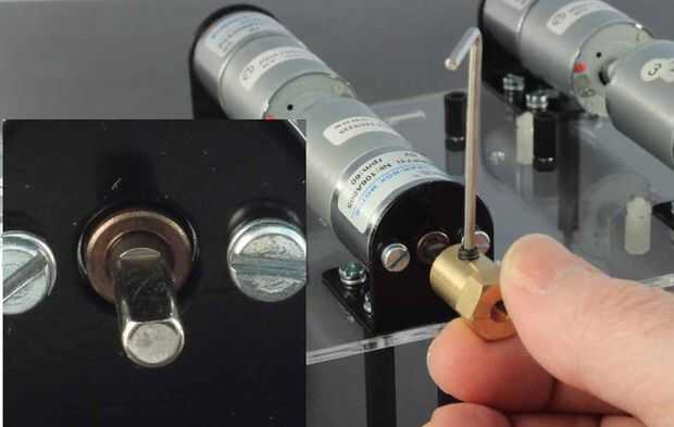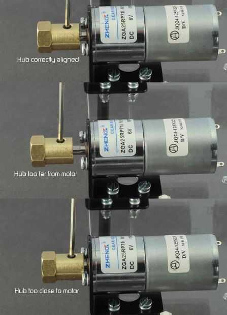 Utilice la llave Allen en el kit de motor para poner el tornillo sin cabeza en el cubo. Se debe ir en libre, no haga fuerza o puede ser Cruz roscado. Si siente que está apretado atornillando, Afloje completamente y vuelva a intentarlo. El motor tiene un tope o una tierra superficie "plana" en el eje.