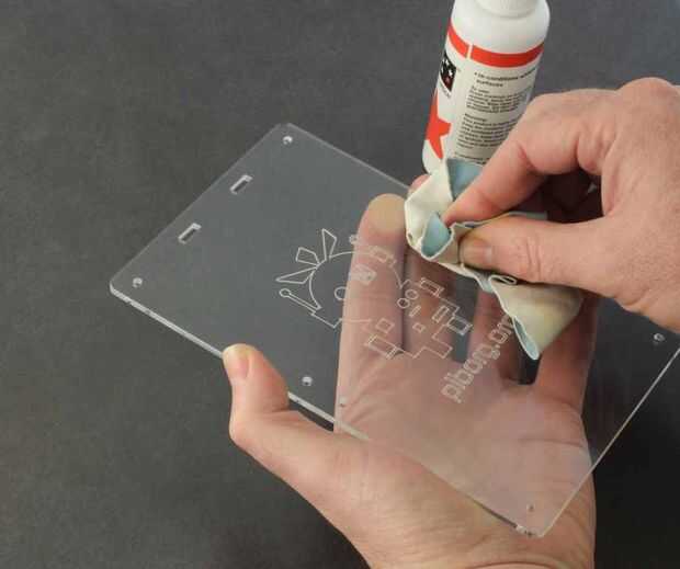 Pelar la capa de protección de plástico blanco de plexiglás y suavemente Limpie todas las piezas de plexiglás con un paño suave como una gamuza de cuero o tela vidrios y agua limpia. Pueden dejar algunas marcas por el cortador del Laser.