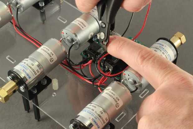 Enrute el cable rojo y negro de la BattBorg a los conectores de V + y GND en el reverso de la PicoBorg con una pequeña cantidad de exceso de cable. Corte el cable a aproximadamente 10-15mm más allá de los conectores. Tira aproximadamente 8mm de los extremos del cable.