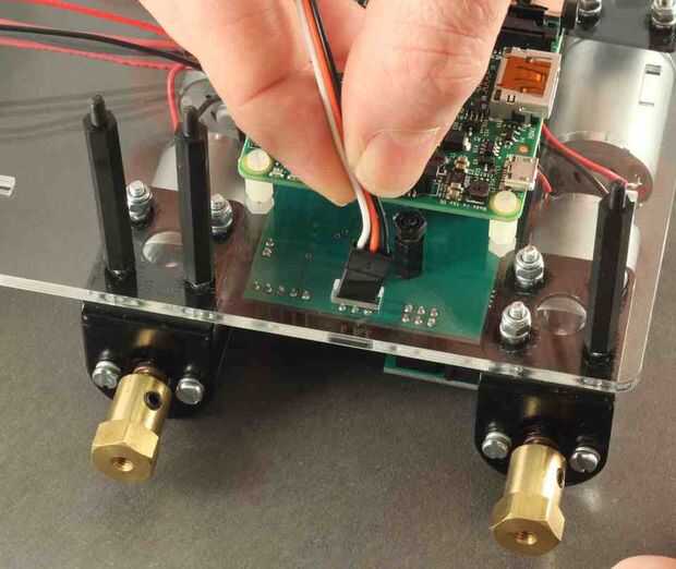 Tomar uno de los cables de comunicación inversa PicoBorg y pase por el orificio de comunicación en la base de metacrilato. Oriente el cable de modo que el cable blanco es en el lado del motor medio.