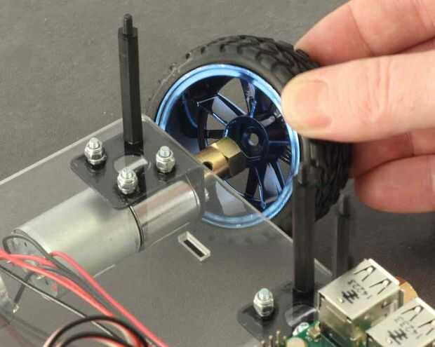 Mantenga el motor añadiendo a la rueda con una mano y la rueda en la otra. Alinear los patrones hexagonales en la rueda y el eje y con una muy pequeña cantidad de presión, empuje la rueda sobre el eje.