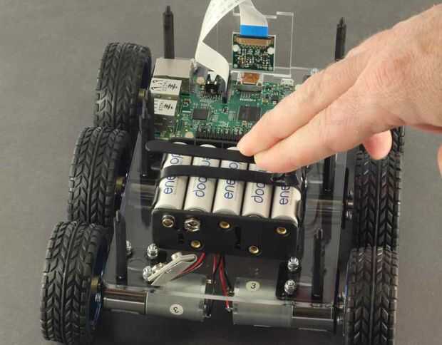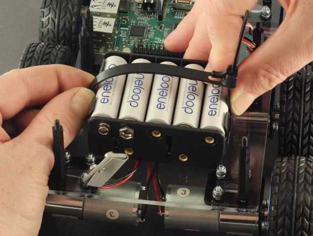 Colocar el lazo de cable reutilizable a través de la ranura de la batería en el plexiglás, entre los cables del motor y el Perpex, luego regresando a través de la ranura de la batería. También asegúrese de que la correa de la batería de 9V se tira autodidacta y está sentado sobre el respaldo de la Asamblea.
