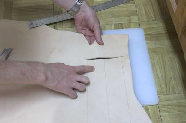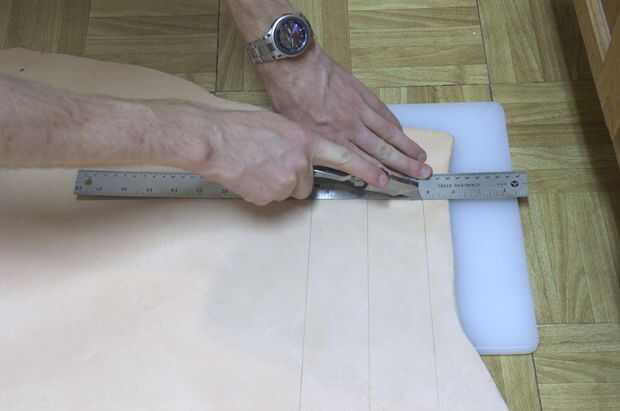 No use demasiada presión hacia abajo en el cuchillo, sólo se anota el cuero con el primer corte. Una vez que corta a lo largo de la línea una vez, seguir sosteniendo la regla en su lugar y recoger el cuchillo y hacer otro corte. Probablemente usted necesitará cortar 3 - 4 veces para obtener todo el camino a través de la piel.