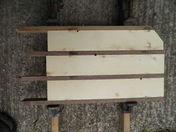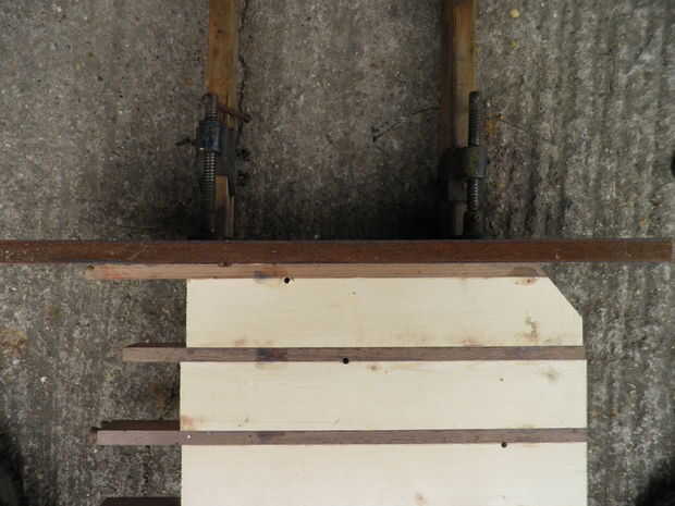 - Sección por el pegamento de la sección y las piezas de cuerpo de madera en la abrazadera. Asegúrese de que no pegue la madera del cuerpo a las planchas centradas.