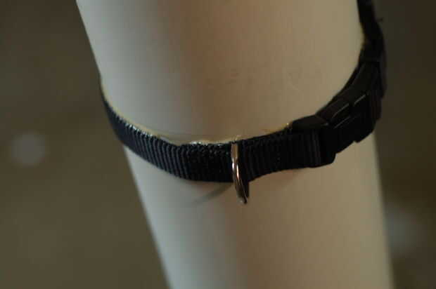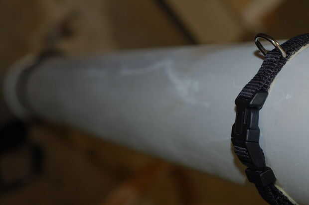 Dependiendo de cuánto es su correa, el pegamento de los collares de perro en así que usted podrá obtener su hombro a través de la correa cuando está todo montado. Cuando está pegado les, coloque los anillos en D para que la correa será sobre cualquier manchas en su pvc... ayudará a ocultar los defectos. Una vez que son secos, clip de la correa en los anillos D de los collares.