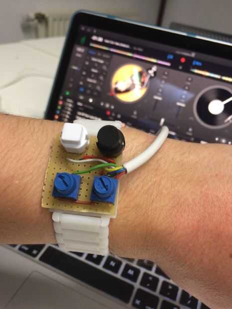 El proyecto consta de dos circuitos de muñeca. En esta primera iteración de DIDI, cada circuito tiene dos botones y dos potenciómetros. Éstos se ha asignado en el software de DJ para alternar el botón reproducir/pausar o activar Fx, o para ajustar un filtro o Fx mojado/seco.