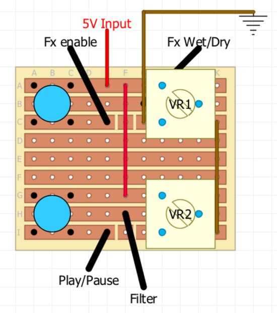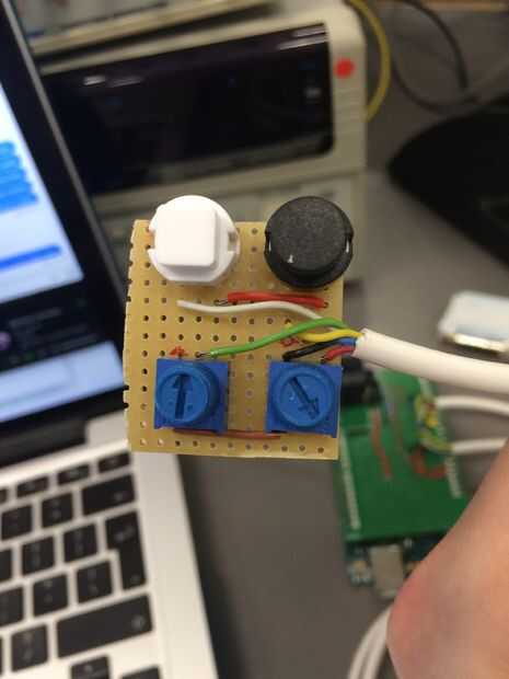 El diseño fue refinado en el diagrama de arriba. La Junta tiene en las conexiones de 5V y tierra. Éstos después son distribuidos alrededor de la Junta adecuadamente. Las señales de salida de los componentes son enviadas a la placa Arduino. La señal del botón es esencialmente 0 o 5V dependiendo de si se pulsa el botón, permitiendo así que la energía fluya. El potenciómetro es también un componente simple para trabajar Arduino ha producido una explicación simple de cómo funciona. potenciómetros de k 500 fueron utilizados aquí.