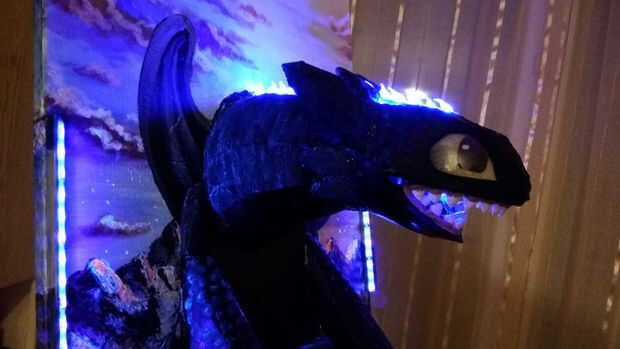 Así que la ideea original era crear un modelo desdentado de la 2 º película, que también puede iluminar en azul. El modelo final será un cuadro alrededor de un modelo desdentado, con leds azules en la boca para simular el plasma, un corto azul llevó la tira en la parte superior sin dientes para iluminar las espinas, 2 blacklight ULTRAVIOLETA led las tiras en los laterales para simular la luz de las escalas (que será pintado con pintura negra) un fotoresistor que detecta día/noche (por la noche se convertirá en una noche de luz por defecto) y un sensor de medición infrarrojos a distancia en su nariz, como un disparador para el "plasma" y para recorrer todos los programas.