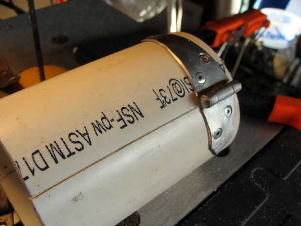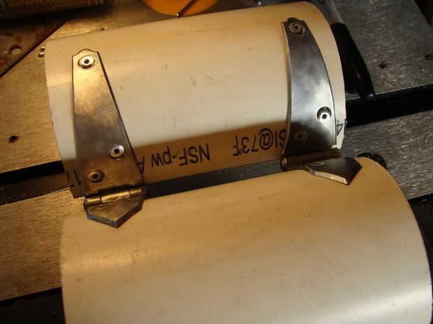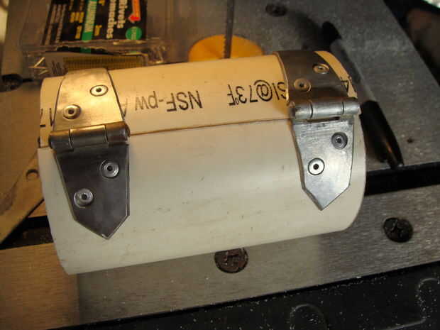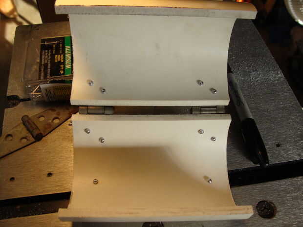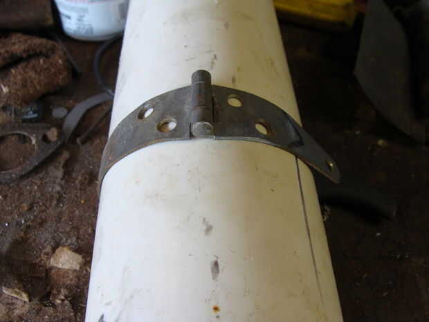 En este punto, puede alinear sus mitades de PVC, endecha las bisagras en él y marcar algunos agujeros. Hice a un lado primero y luego clavado, luego marcado y perforado del otro lado para que se alineen las bisagras. Parecía más fácil en el momento. Asegúrese de que usted marque los agujeros de centrado o bien terminarán los remaches torcido, como mina. Bueno, el estilo consigue todo y trabajar. jaja.
