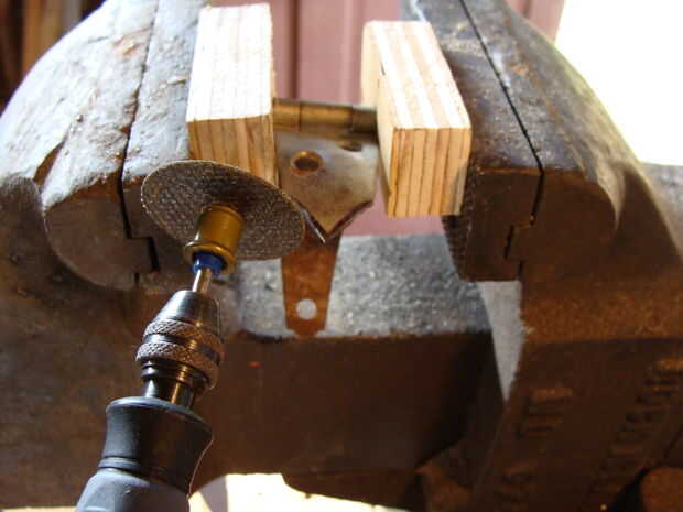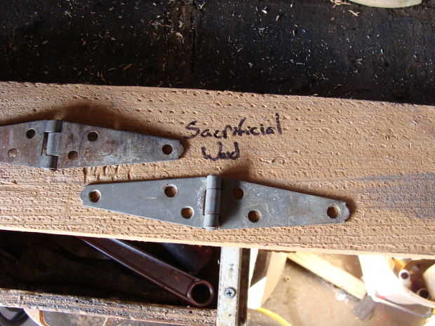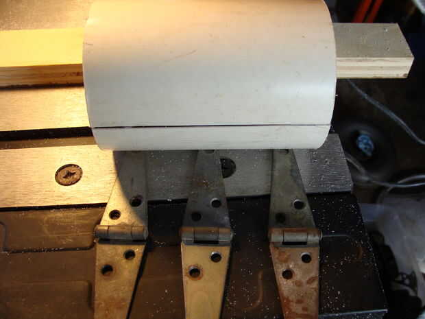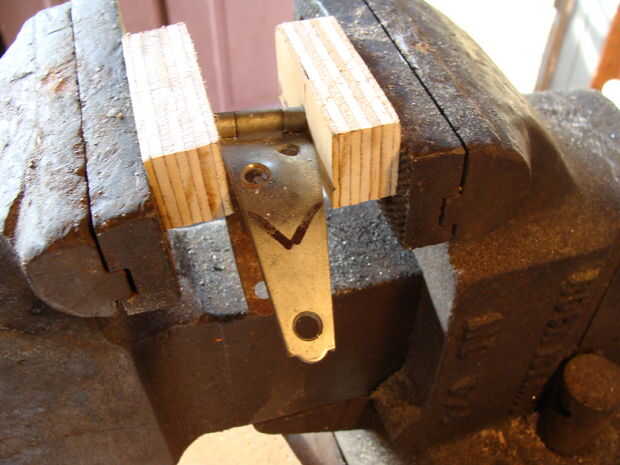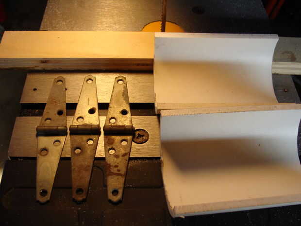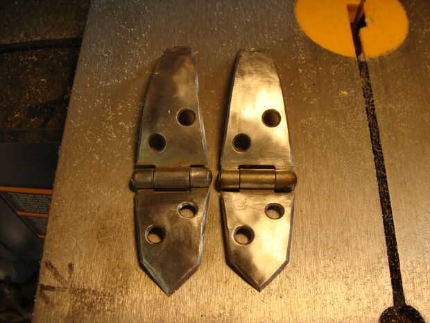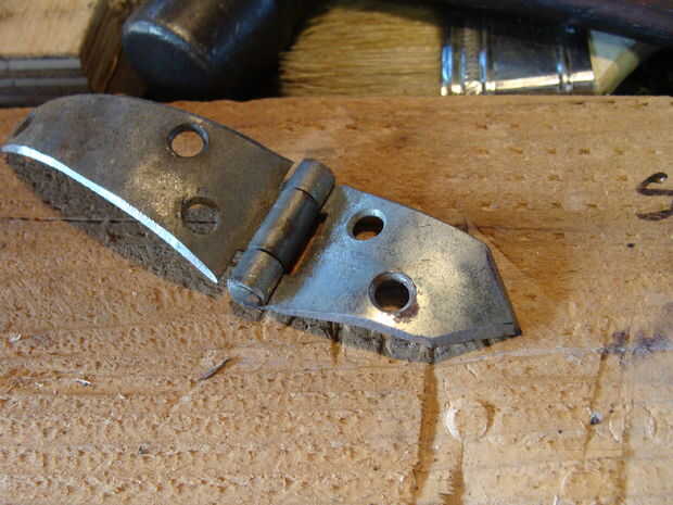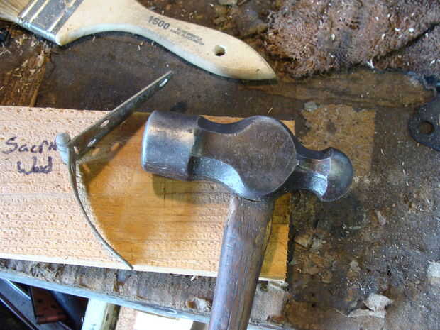 Una vez que tengas tus bisagras, necesitará modificarlos. La mayoría de las bisagras son planas, por lo que se necesita poner la curva en el em. Hay varias maneras de hacer esto, pero lo hice el camino de madera sacrificatorios. Trata utilizando un pedazo de madera suave y batir en las bisagras que les curva. Este es un metal trabajando cosa, aunque por lo general, utilizar una bolsa/almohadilla de cuero. No tengo uno de estos, por lo que la madera es perfecta. Utilizar el lado de la bola de un martillo de bola. Hacen lujo martillos para esto, pero yo no soy un tipo elegante, así que esto funciona a la perfección.