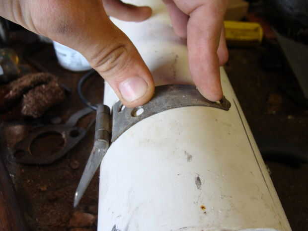 No hace falta hits mucho o muy duros para conseguir una buena curva en el metal. En un extremo, era sólo de planificación sobre el uso de 2 agujeros, así que dibujó un extremo de la flecha y no molestaba la curva más allá de ella. Tener el PVC a mano para verificar la curva de contra. Cuando es bueno, hacer lo siguiente. Cuando tienes las bisagras curvas, puede ir adelante y corte a lo largo de la flecha. Esto no es necesario, pero da respiro al teléfono y que se vea cool. ¿Eso es lo que se trata, a la derecha? Después de eso, fui a la amoladora de la curva y tierra algunos biseles agradables en em. Yo entonces tomó una rueda de lijar a em ellos y abrillantado.
