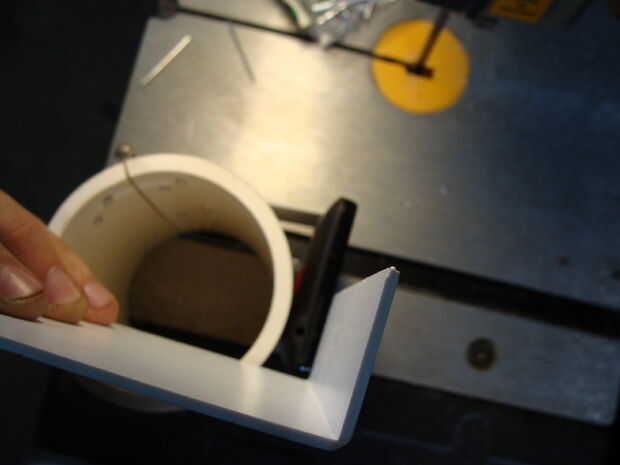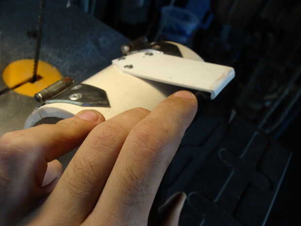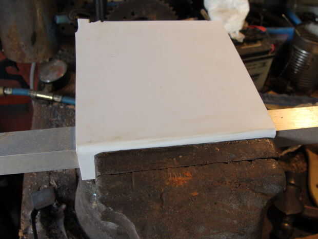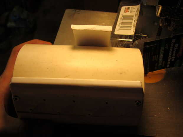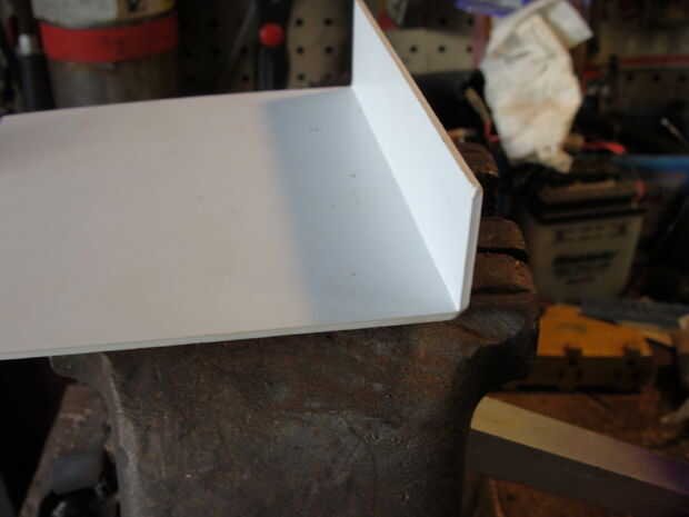 Para la mucho más robusta pieza de fondo, utilicé una pieza mucho más amplia de estireno y había doblado a 90 en un borde. Entonces tuve que doblar donde reuniría el PVC en el ángulo opuesto. Después en forma de la superficie de montaje, córtelo en flechas, los orificios perforados y había clavado en.