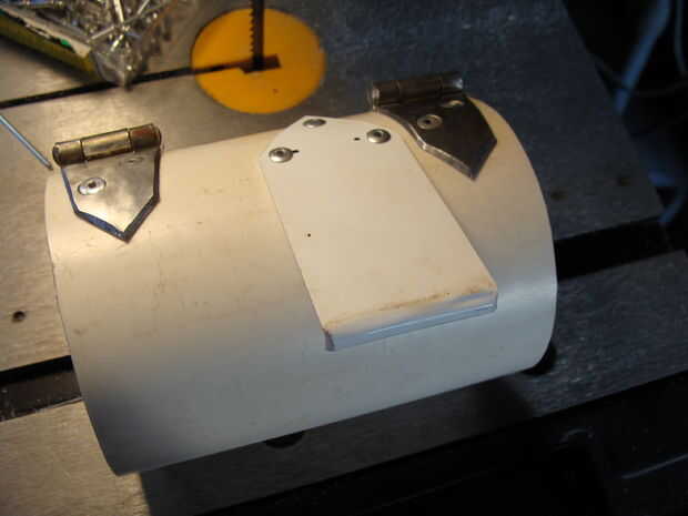 En primer lugar, he formado la pieza superior, que también funciona como un cierre. Esto es cómo se consigue el teléfono en y fuera de la Pipboy 4 G. Simplemente tomó el pedazo de flaco y doblar el extremo en 90 grados con un poco de persuasión de mi soplete de aire caliente. Luego cortar la pieza de una flecha en un extremo, tres agujeros perforados y había atado con tres remaches. Bastante simple.