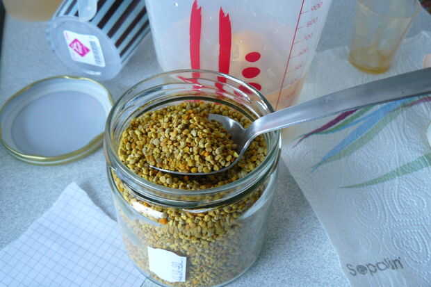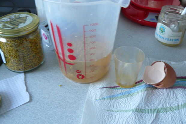 Poner en ella una cruda de huevo, 62ml (aproximadamente) de miel, vitaminas y minerales (yo uso una cuchara de polen).