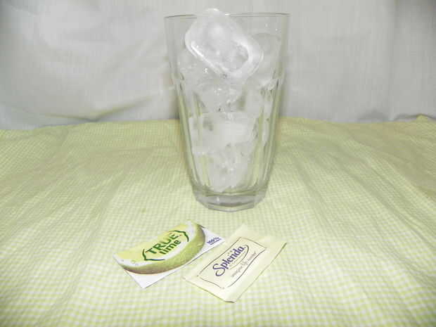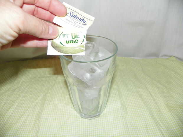 Llene el vaso con hielo. Añadir 1 paquete de Splenda y un paquete verdadero cal o el jugo de 1/2 limón.