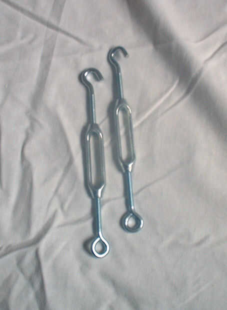 Dos coladores de gancho y del ojo / tensores como se denominan a veces. Utilicé el más pequeño que pude encontrar, que son 14mm OD en el OD hebilla y 5mm en la rosca. Como estas de Screwfix.