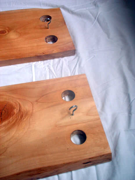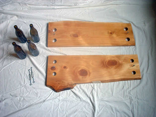Dos tablas de madera, preparado como se muestra en la plantilla .pdf - cuidadosa! Hay dos diámetros diferentes, y si va a salir uno borde áspero como lo hice aquí, asegúrese de tomar sus medidas desde el borde de la recta de referencia.