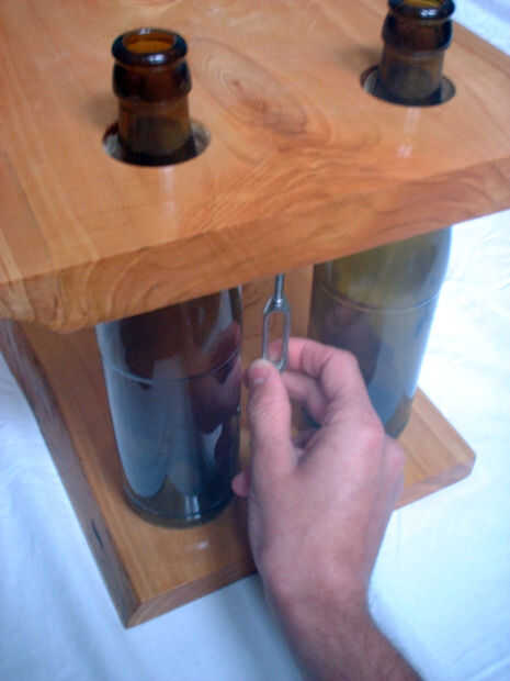 estantería construida de encontrar madera y utiliza botellas de cerveza. Esta estantería es diseñado para sentarse en un mostrador de la cocina o escritorio, o construido a partir de la planta. Es un sistema compacto que es fácilmente montado, adapta