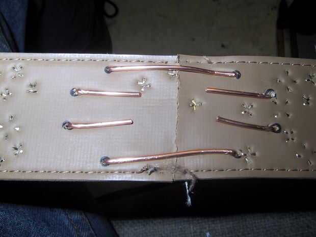 Empujar los trozos de alambre en los orificios como se muestra en las fotos. engarzar los alambres planos.