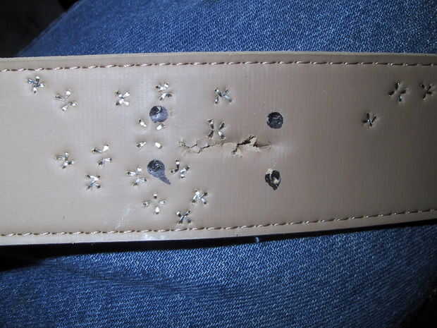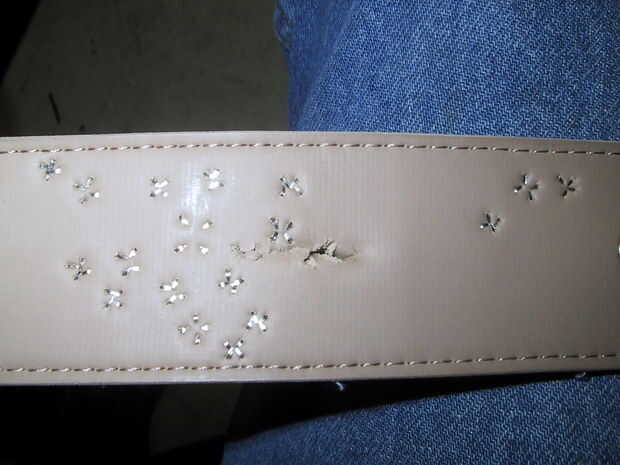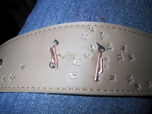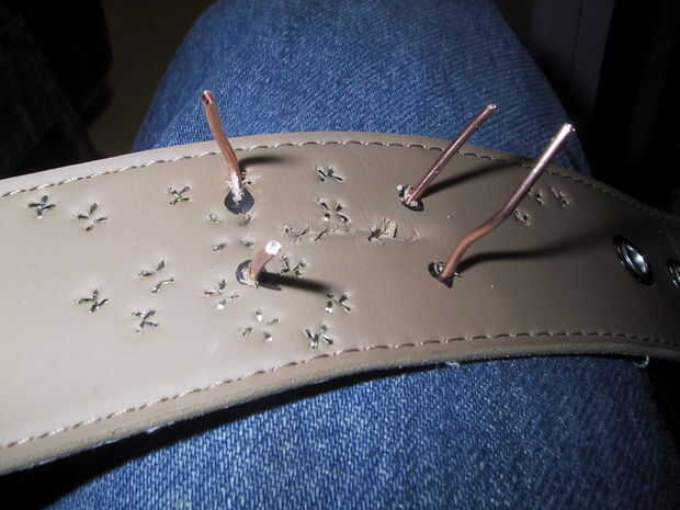El dueño de este cinturón asomó un agujero extra para el diente de la hebilla en. Este agujero había empezado a rasgarse a lo largo, así que añadido algunos más pedacitos de alambre para reforzarlo. Usted debe ser capaz de comprender este paso en las fotos.