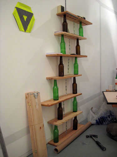 diez verde es un modular estantería sistema, simplemente de locales reciclados.Este prototipo fue construido con la confianza de la casa de entrenador en Glasgow, usando botellas de su centro de reciclaje y la madera desde el mantenimiento de sus pro