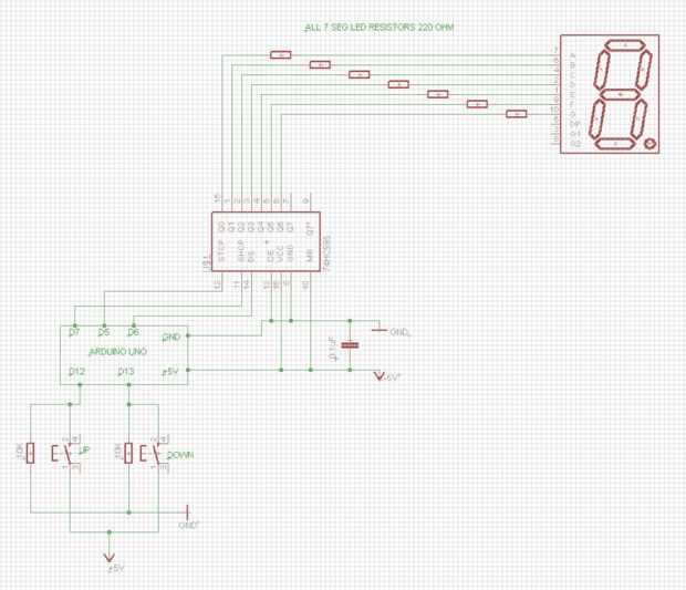 Contador de 7 segmentos LED, Multiplexión usando 74HC595 8 bit shift register, incremento contador cero ocho a cero a través de interruptores de botón