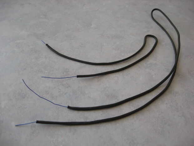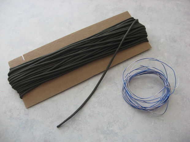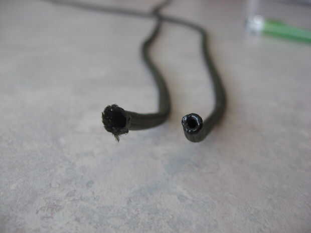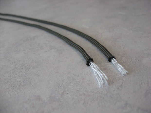 Cortar dos hilos de paracord, uno de 44" y el otro de 20". Quitar las hebras de paracord interior. Cortar dos tramos coincidentes de alambre e insertarlos en las piezas huecas de paracord.