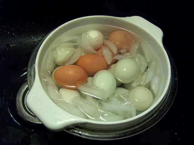 Si usted está preocupado acerca de cáscaras se agrieta sólo levantar los huevos individualmente con la espumadera y delicadamente en el baño de hielo.