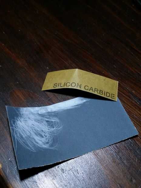 Algunos parer de lija de grano fino. Un pedazo más pequeño de acerca de 2 x 5 cm asas mejor y he encontrado que grano de carburo de silicona 600 Waterpaper funciona mejor pero nada entre 500-800 grano debería funcionar bien aunque puede variar el resultado entre granos (que no se necesitan agua con el Waterpaper para este difícil aplicación)