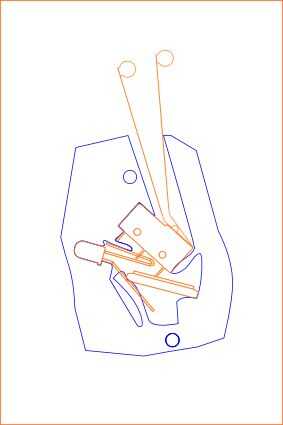 Los orificios de montaje del interruptor son sólo 2,5 mm. Como pernos largos con ese diámetro no son muy comunes, decido no utilizar estos agujeros para mantener el interruptor en su lugar en la estructura de capas. En su lugar utilicé la libertad de forma y precisión láser corte ofrece y diseña una forma sujeta firmemente el interruptor. He medido el interruptor y dibujó la forma. Como primera aproximación simple que no tomé en cuenta cualquier separación. O realmente dibujando sólo el interruptor de medida, la mitad de la anchura del corte láser (0,1 mm) sirve como despacho.