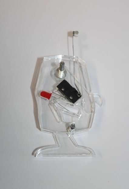 Paso siguiente era mantenerla presionada contra una de las patas del interruptor, mediante el diseño de una "primavera" basada en un corte estrecho. Experimenté con un pedazo de hoja de acrílico, corte con una sierra para metales. La eficacia y la durabilidad es algo que debe comprobarse en la práctica, pero tengo una buena impresión del láser cortar piezas.