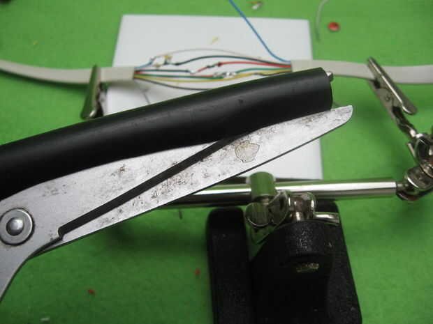 En lugar de empujar con fuerza los cables en la manguera de riego protectora, es probablemente más fácil cortar una longitud corta con tijeras. Las silletas de la manguera tendrá que cerrar otra vez luego,