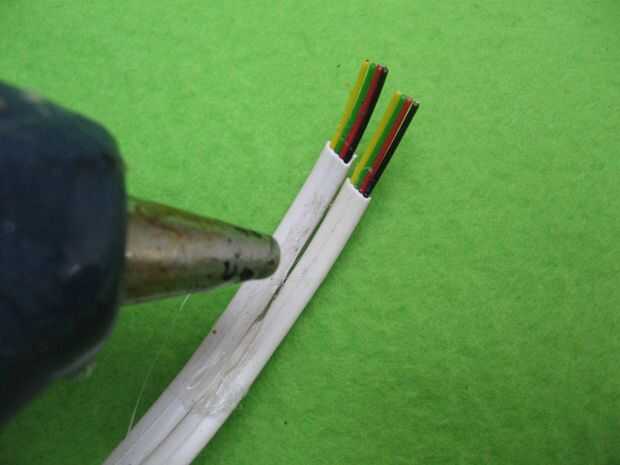 Si no puede localizar el recomendado: cable plano 8, entonces tal vez caliente derrite el pegamento 2 x 4 alambre grado "plata satinado" cables de teléfono juntos lado a lado! Alambre color match-ups ahora será más complicados, afinación será probablemente algo alterada, y el enfoque de 2 cable (una vez pegado) no se presta tan fácilmente a liar para uso portátil.