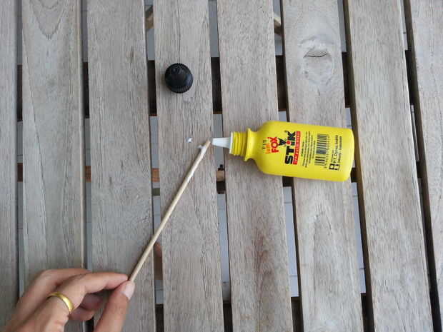 Untar el pegamento de madera para el palo/brochetas de bambú. Borrón de transferencia media-media, para reducir al mínimo sus dedos consiguiendo cubiertos de pegamento. No utilice demasiado pegamento porque puede endurecer el hilo, solo uso lo suficiente como para hacer el hilado se adhieren a los pinchos