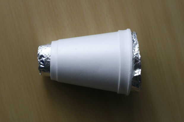El interior de la Copa con el papel de aluminio de la línea. Puede ser difícil de usar solamente una sola pieza ya que la abertura es más grande en un extremo. También mantenía la cara sin brillo hacia el interior de la copa para aumentar la difusión de la luz. No es gran cosa si la lámina es arrugada ya sea.
