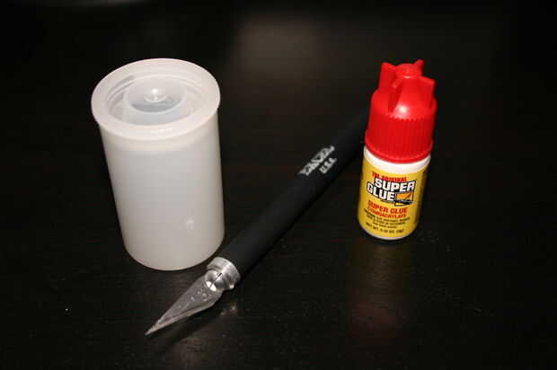 cartucho de película en blanco translúcido, navaja, pegamento,