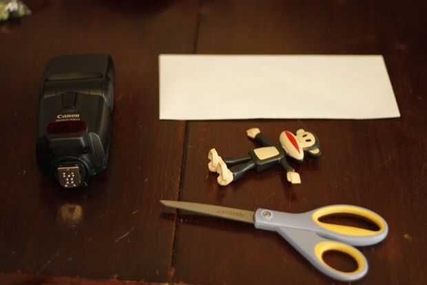 Vas a necesitar 3 cosas. Flash Speedlight, tijeras y sobre estándar. Ah y un tema para tomar una foto :)