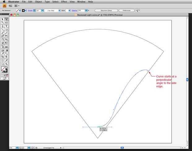 Utilizando una herramienta Bézier, dibuje de una ' curva que va desde el borde de un lado del cono aplanado a línea de centro (invisible) del cono. Asegúrese de que esta curva reúne el borde lateral en un ángulo perpendicular.