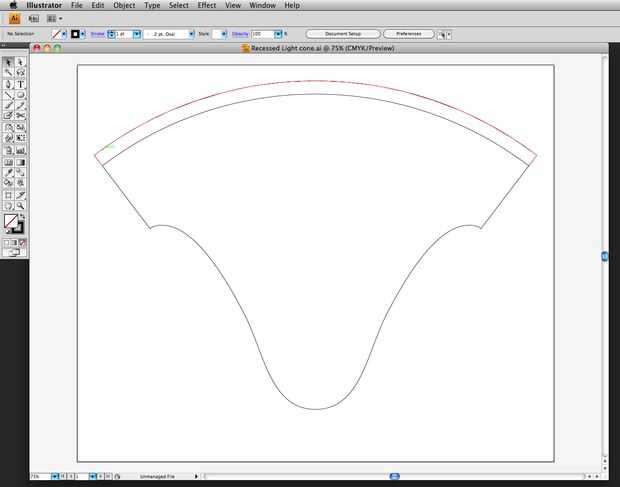 - Compensar el arco del cono aplanado (o 'corteza de pizza' borde) por 1/2", para que tengas una nueva línea que es 1/2" fuera del arco original.