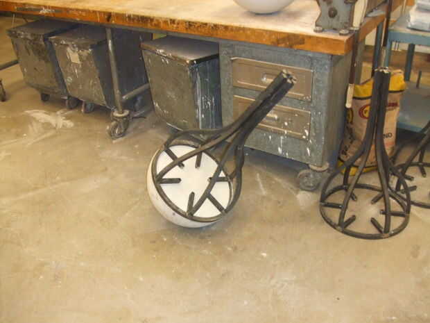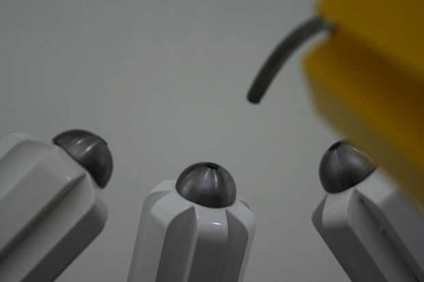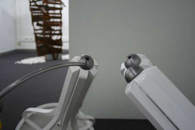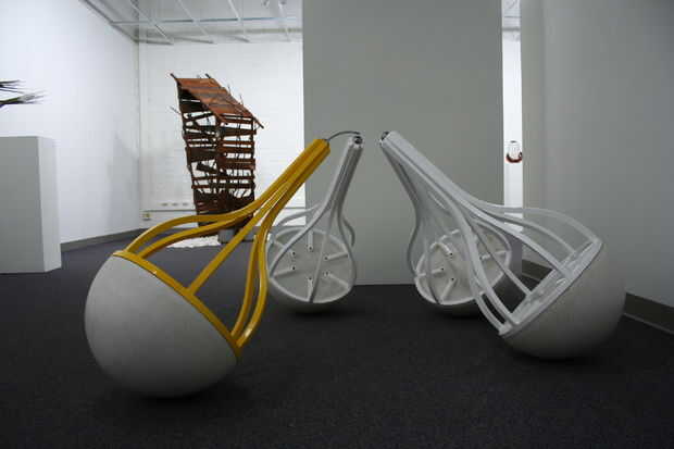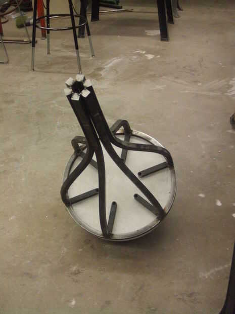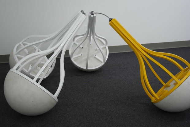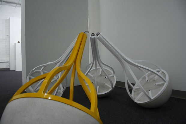 Fue pintada de tres marcos de acero Unidos a hemisferios de cemento prefabricado blanco. La escultura tenía tres compañeros y un profesor. Las piezas blancas representan a los estudiantes y el amarillo el profesor. Es un sistema bastante básico. "Estambre" de la pieza amarilla tenía un LED en el extremo de lo que alimenta la luz para fotosensores en los hemisferios de las piezas blancas. El LED fue controlado por un circuito temporizador simple que enciende y apaga en patrones aparentemente al azar. Como la luz se intensificó los fotosensores activa sus propios circuitos de temporizador que creó ciertas oscilaciones conectado a un piezoeléctrico. Había cada "peer" es sonido propio que se intensificaría con la luz, por lo que terminó con tres sonidos diferentes corriendo todos en concierto llenando la galería con algunas realmente divertida mezcla de sonidos molestos y agradable. Se ha cambiado el sonido añadiendo un potenciómetro a la placa de circuito por lo que yo podía manipular las piezas individualmente. En una nota lateral, los asistentes de la galería no se que encantados con la pieza. Vine en cambiar las baterías una mañana y había cinta sobre los sensores de la foto. Como se imaginarán me no emocionó para.