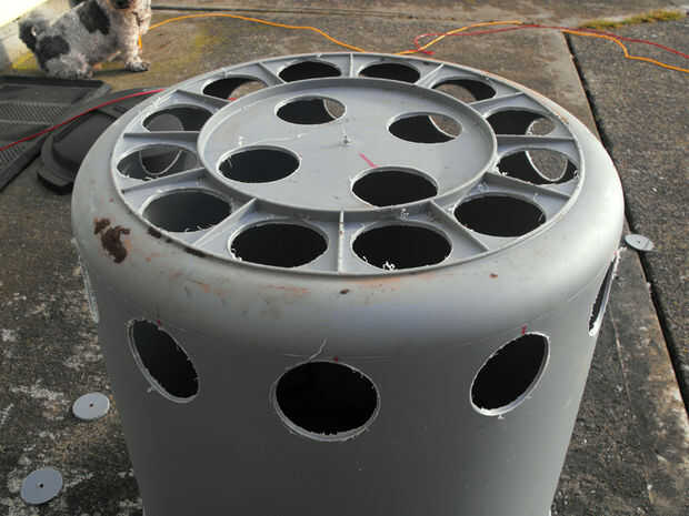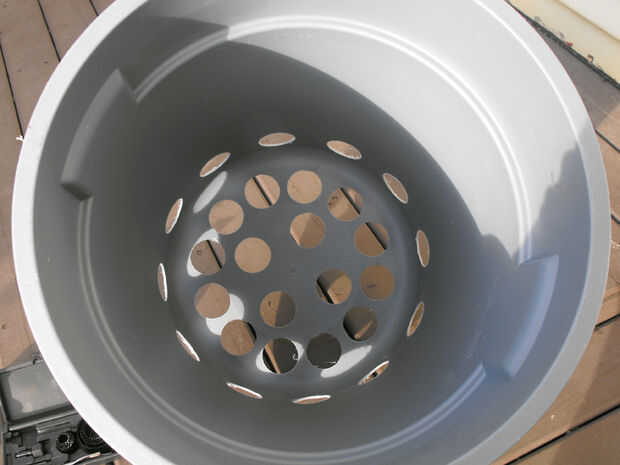 Después de haber perforado todos los agujeros en la parte inferior, haga una serie de orificios alrededor de la circunferencia inferior del recipiente. Otra vez usé los soportes moldeados como líneas de referencia para obtener el espaciado adecuado.
