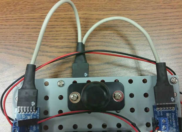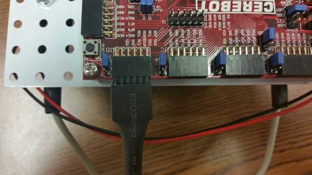 Conecte los dos módulos de PmodHB5 para Puerto JD en el chipKIT MX4 Pro tablero utilizando los dos cables de 6 pines. Usando el PmodHB5s, conecte el motor izquierdo de la fila inferior de JD y el motor adecuado a la fila superior de JD. Utilice el marcador en el conector del cable para asegurarse que pin colocaciones en alineación al conectar las placas. Ver las siguientes imágenes.