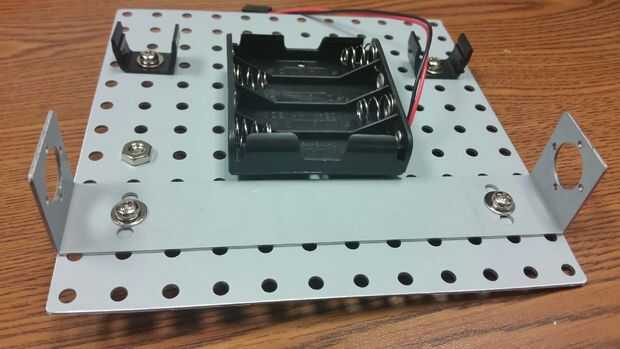 Girar sobre la plataforma. Instale el soporte de la batería a la plataforma con la tira de Velcro más corta, colocando el lado más corto contra el montaje del motor.