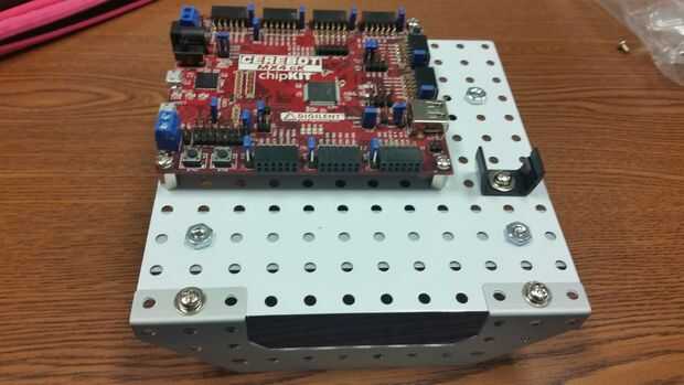 Voltee la plataforma y coloque el lado con la bancada más cercana a usted. Monte el chipKIT MX4 Pro en la esquina superior izquierda con el kit de soporte de Hardware.