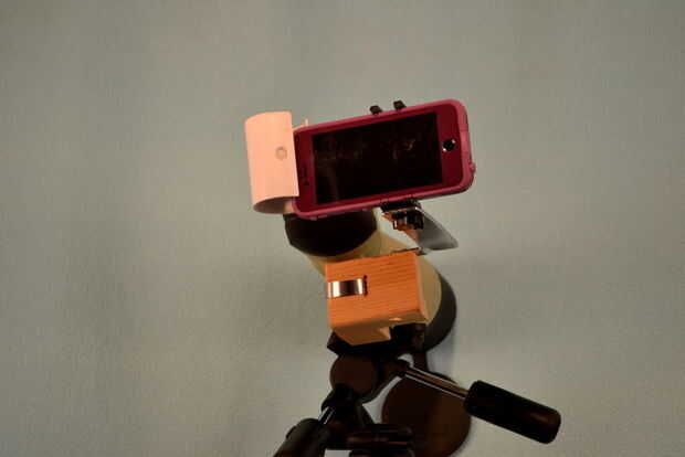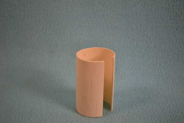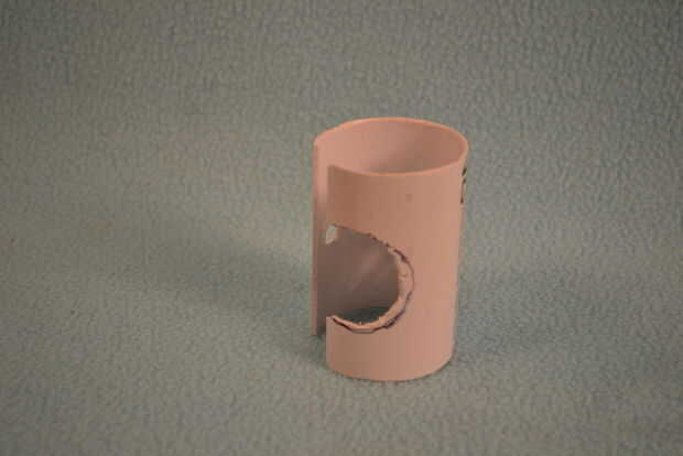 La segunda adaptación fue fijar firmemente la pieza ojo el teléfono. Había tallado una sección corta de tubería de PVC de 2" con mi sierra y un cuchillo. Cortar un arco y me raje en la chatarra del tubo de PVC para hacer una pinza personalizada.