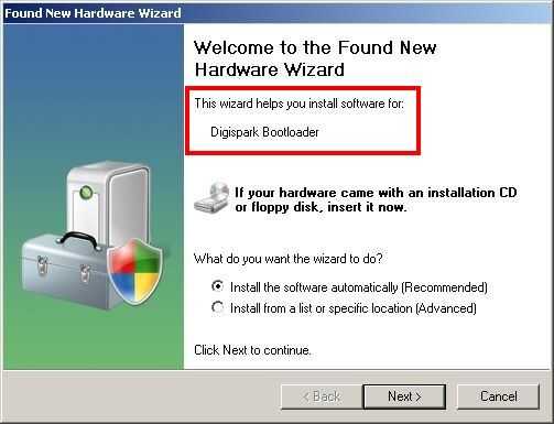 1. Digispark conectar al puerto USB de la computadora 2. USB dispositivo se detecta el uso por primera vez y le a instalar gestor de arranque de Digispark. 3. Haga clic en el botón siguiente hasta el final.