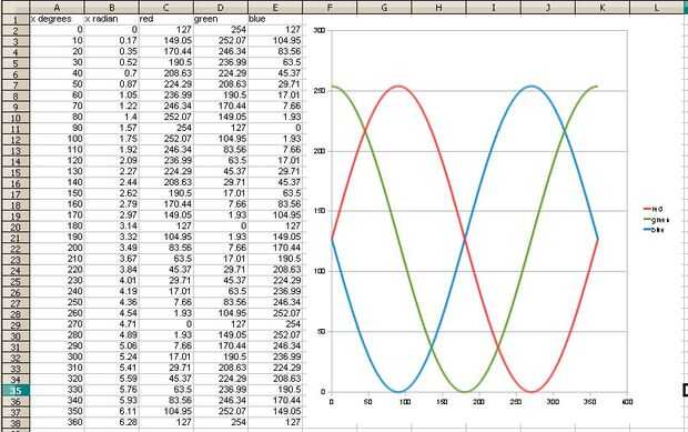 Contamos con tres LEDs que queremos que interactúan entre sí para dar cambios sutiles en los valores de color aditivo. Por lo tanto tuvimos que utilizar un cambio de fase para cada color. Esto donde se pone complicado para nosotros. Los ordenadores utilizan radianes, no grados. Por lo tanto el desplazamiento de fase que se expresa en radianes. Resulta que la conversión es simple. 90 ° = 90/180 * radianes PI o 1/2 * radianes de PI. Un desfase de 270° requeriría 3/2 * radianes de PI. Si no alteramos el período ahora tenemos tres funciones, una para cada color de los LED