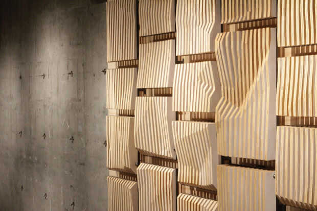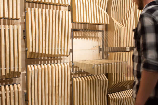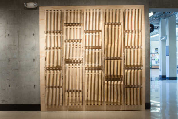 La fabricación en su mayoría involucrados CNC de varias láminas de madera contrachapada y soldadura juntos 23 Marcos únicos para sujetar las lamas de madera y montaje a la pared. Porque ya tenía un archivo digital de mi forma, es fácil de medir el ancho de la madera contrachapada (3/4") y elija un espacio (1/2") que bien podría corté mi forma en listones. I luego organizada y jerarquizada, de eficiencia y lo no para residuos, una trayectoria de herramienta de cada listón para que mi router CNC puede cortar exacto. Los listones de madera entonces fueron acabados con una capa transparente y blanco decapado con el fin de distinguir ambos conjuntos de datos. El grupo de usuarios era blanco y la densidad de la actividad fue de capa clara, de tal manera se dio prioridad a los datos de grupo de usuario que muestran donde es mayor o menor que la densidad revestida claro de los datos de actividad. A continuación, usando Rhinoceros, modelo marcos para sujetar y montar los listones de base sobre perfiles metálicos (tales como ángulos, canales y barras) fácilmente podría comprar localmente en un taller de metal. Hice un inventario de las piezas que único recorte base sobre mi modelo de rinoceronte, cortado a la longitud específica, y MiG soldando. Como era capaz de crear una plantilla exacta para mí en modelo 3D de la computadora, todo encajan perfectamente y se unieron para crear la pared acabada. Como se puede ver, he tomado datos intangibles y convertido en una forma interactiva tangible. Ahora tú decides cómo vas a convertir sus datos en un formulario!