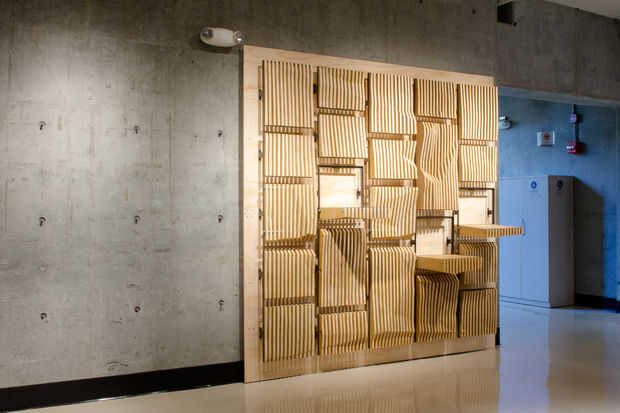 Para mi proyecto, he decidido dividir el formulario en varios listones verticales que actúan como cortes de sección para mostrar el registro de dos conjuntos diferentes de datos. Decido que este datos mejor harías sentado en una pared, así que organizada como una pared vertical de 7'x 7' (7'x 7' similar a la milla 7 por rejilla de 7 millas de SF). Estos listones donde luego más organizados en estantes de cortan por una elección estética que funcional tamaños para mi pared previsto. Pensé que sería divertido para hacerlo una instalación interactiva por lo que he diseñado algunos de los estantes, uno en cada columna asegurándose de que tengan diferentes alturas, rebatibles. Estos estantes podrían convertirse entonces en espacio para las personas a trabajar, descansar sus pertenencias, o incluso a crear una reunión informal de punto.