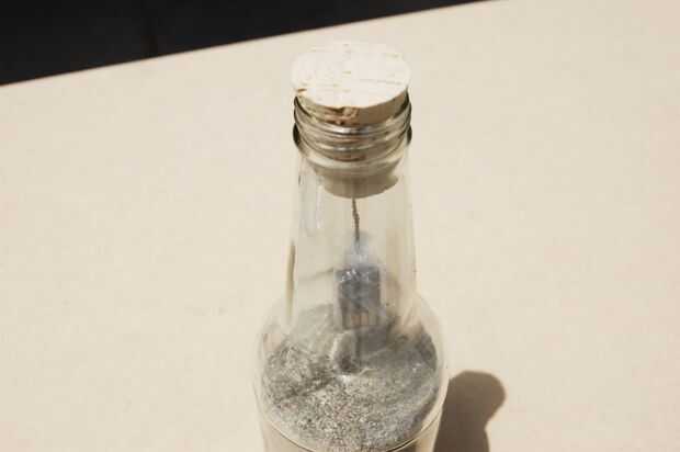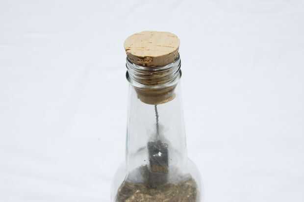 Introducir el corcho en la botella, usando una prensa de sujeción f el corcho en su lugar. Utilice las medidas de seguridad adecuadas ya que la botella tiene un potencial muy pequeño de última hora.